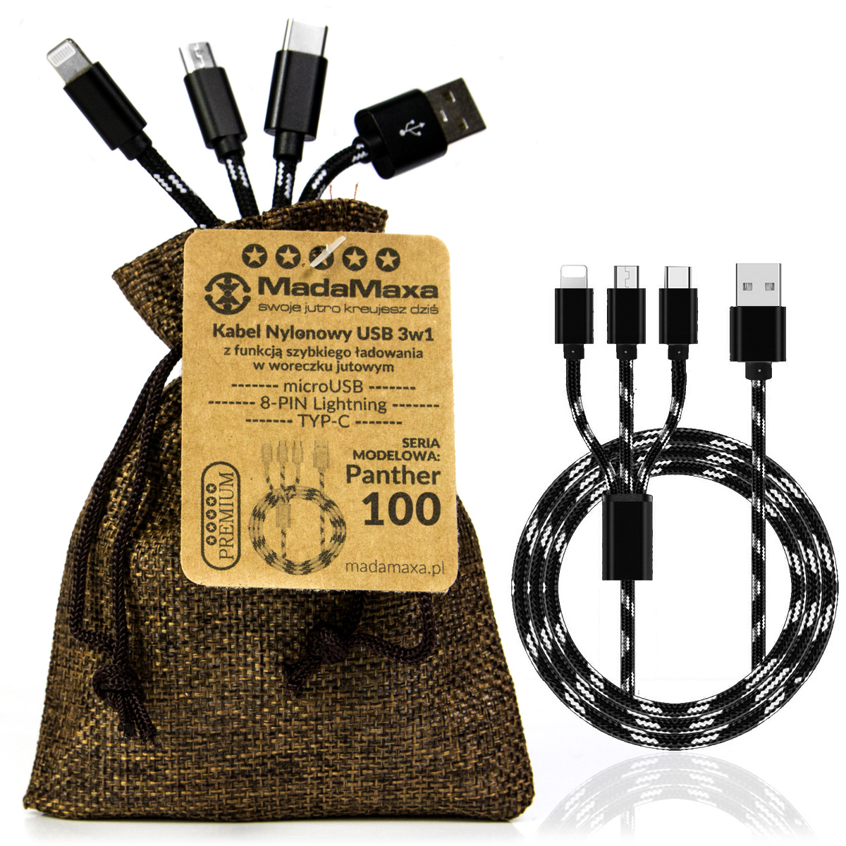KABEL Nylonowy USB 3w1, microUSB, TYP-C, 8-PIN Lightning, MadaMaxa Black Panther 100cm czarno-biały 2.4A