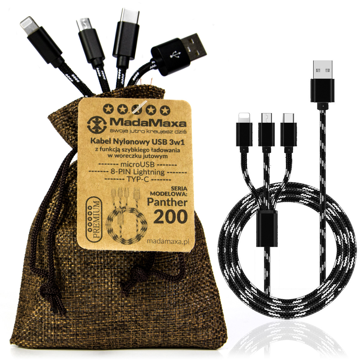 KABEL Nylonowy USB 3w1, microUSB, TYP-C, 8-PIN Lightning, MadaMaxa Black Panther 200cm czarno-biały 2.0A
