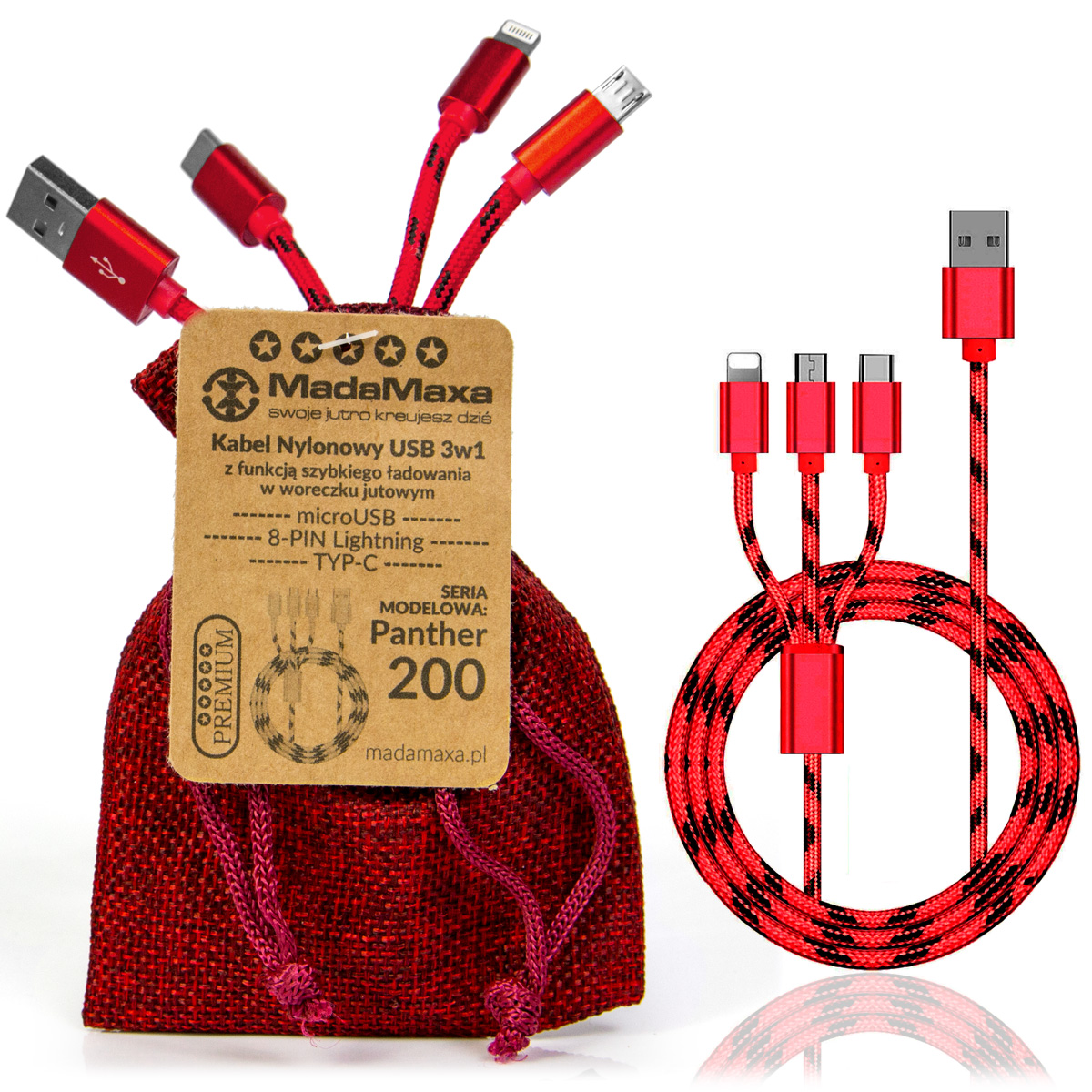 KABEL Nylonowy USB 3w1, microUSB, TYP-C, 8-PIN Lightning, 200cm Red Panther czerwono-czarny 2.0A KF79