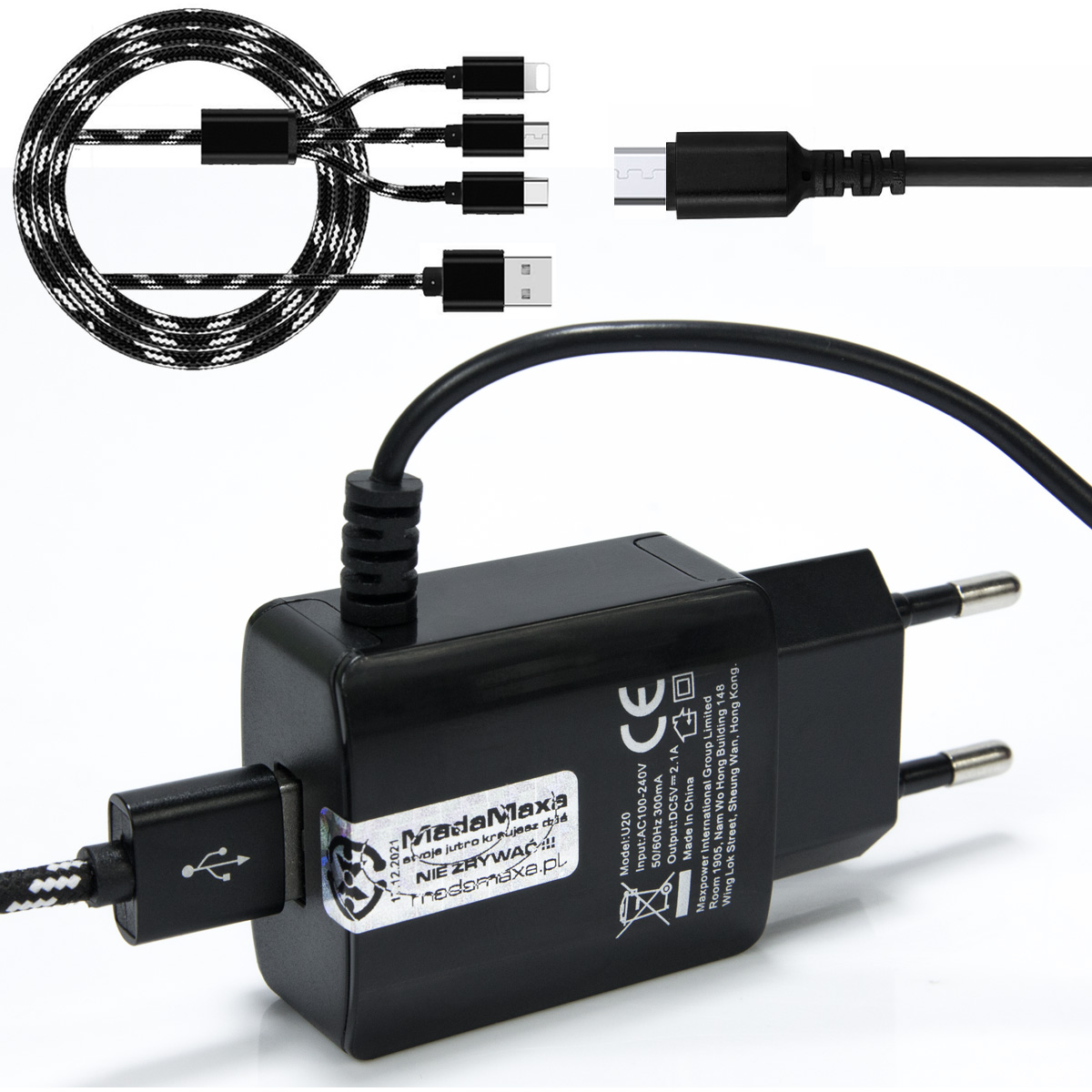 Ładowarka Sieciowa do Telefonu 1x USB wtyk microUSB + smycz – RVR-BLACK-MICRO-030 KF94