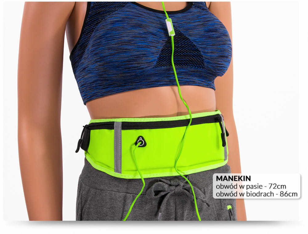 wejście na słuchawki, zapięcie na klamrę, dwie kieszenie na klucze, elementy odblaskowe
